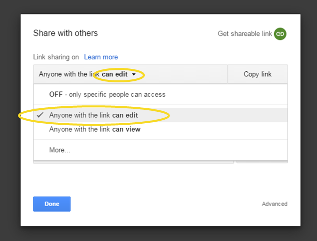 - Change settings from Anyone with the link "can view" to Anyone with the link "can edit" on the drop down.