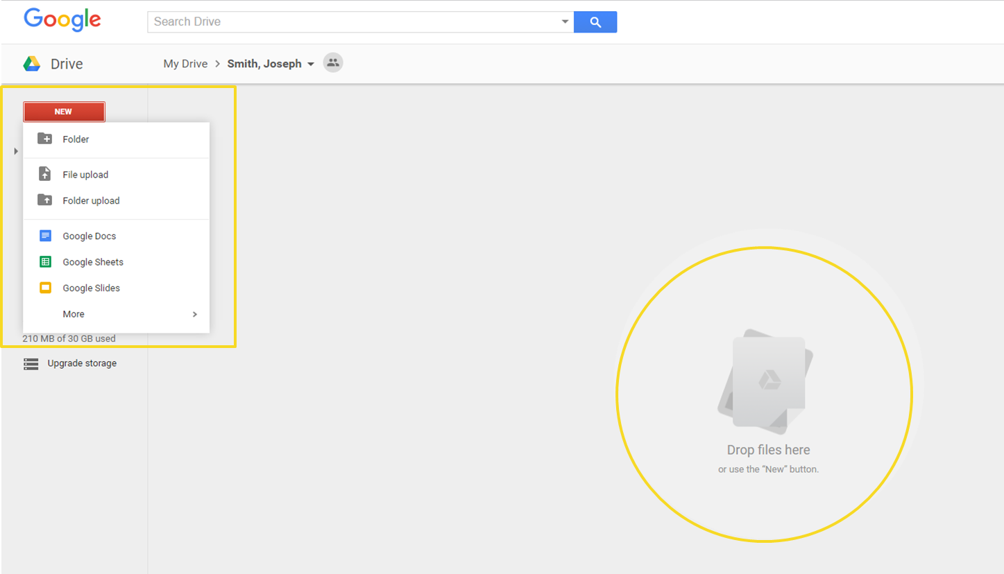 You can either use the "New" button to add any files or folders from your computer to your Shared Folder, or you can drag your files or folders directly from your computer to the space on your Google Drive as circled below.