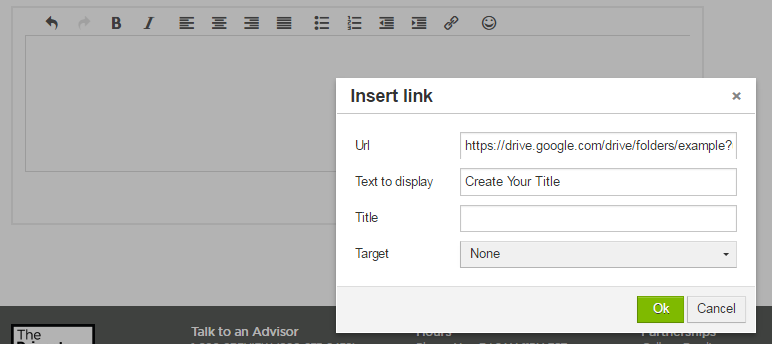 Once added, scroll to the bottom of your dashboard and insert the shareable link into the messaging box on your dashboard by using the "insert/edit link" icon.